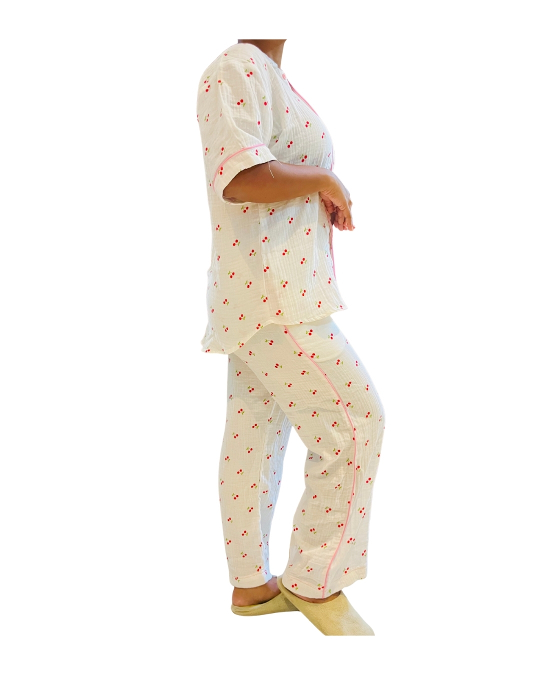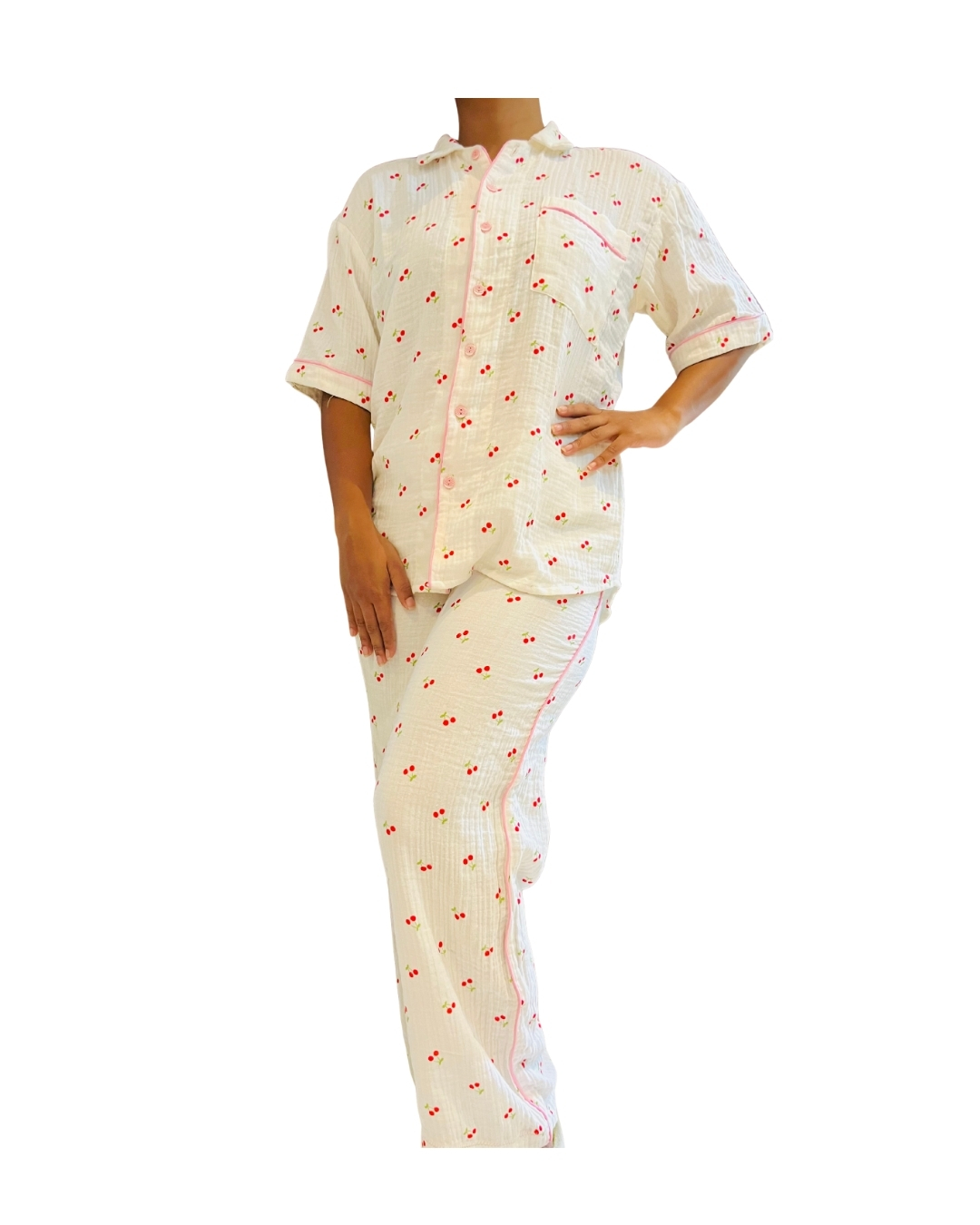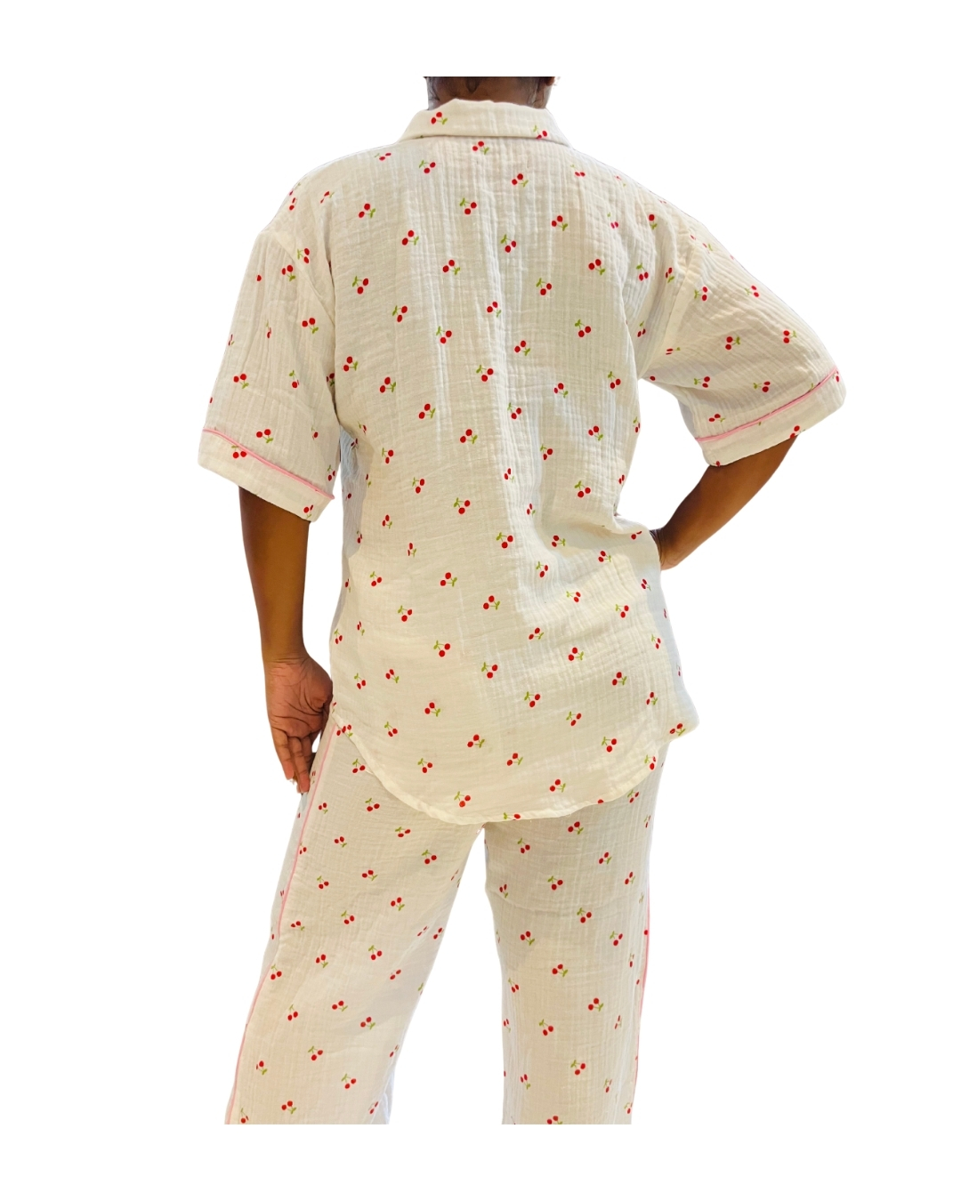 The Twinkle Set is designed to make you feel seen — cute, confident, and effortlessly stylish. With its oversized off-shoulder top and straight leg pants in a dreamy cherry print, this set turns simple moments into aesthetic ones. It’s comfort you can relax in, and style you’ll want to show off.